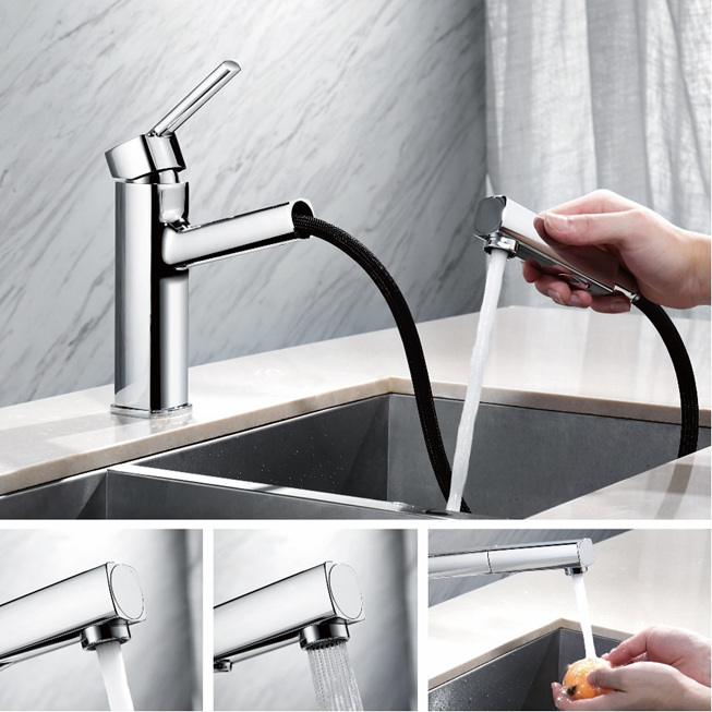 Cartucho disco cerámico 35 mm. Peso: 2600 gr. Material del cuerpo: Latón. Material de la maneta: Zamak. Caño extraíble con pulsador de dos funciones: chorro normal y ducha. Color: Cromo brillo. Material: Latón.